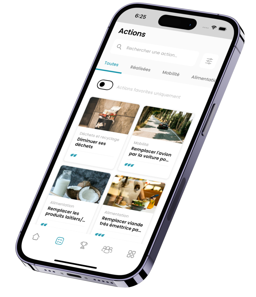 Notre application propose des challenges collectifs pour t’aider à expérimenter un mode de vie durable, pas à pas.